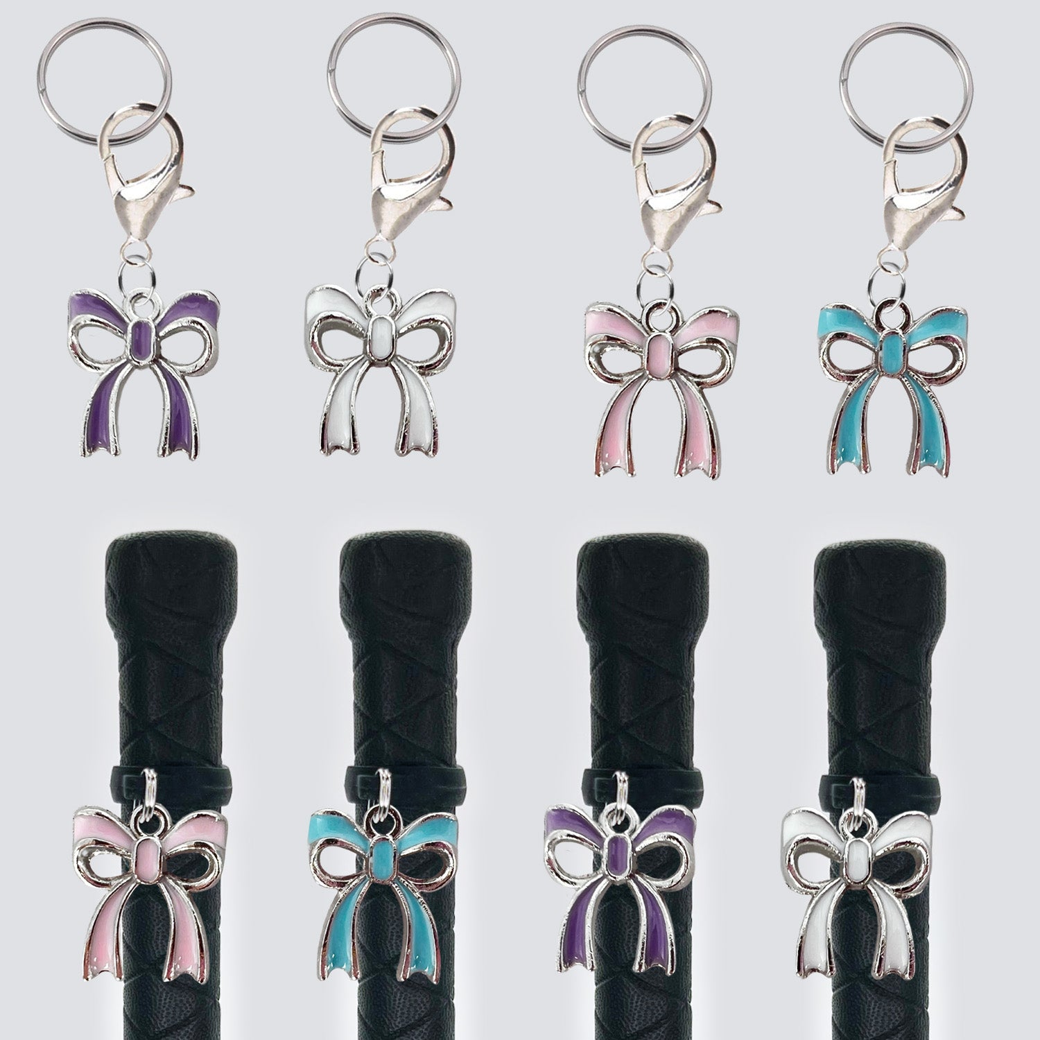 Designed to stand out, our unique Crop Charms make finding your crop in a lineup of basic black ones effortless. Made with a stretch silicone band, each charm fits most standard crop handles snugly, ensuring it stays securely in place without slipping. Crafted with split rings instead of jump rings, you can ride confidently knowing your charm won't accidentally fall off.